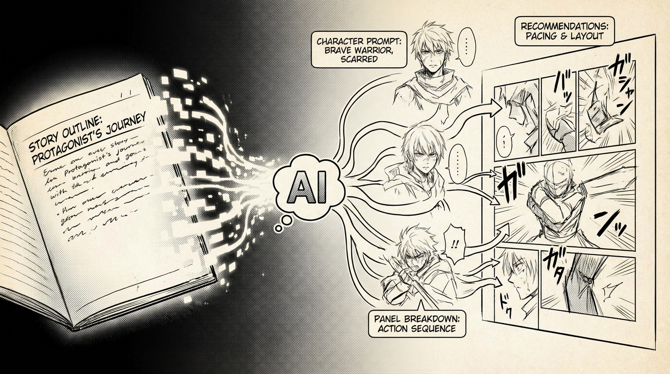 From story text to finished manga, comic, or webtoon: upload your story, get AI character and panel recommendations, then generate and export. No art degree or huge budget—manual control at every step.