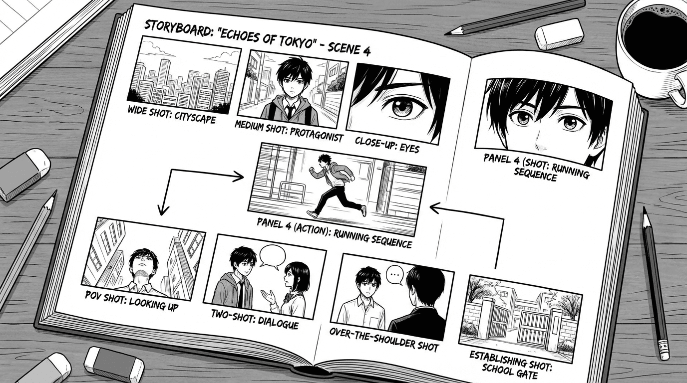 Tell the AI the framing: “Wide shot of…”, “Close-up on her face…”, “Medium shot, two characters at the table…” That sets the composition so you get a full scene versus a portrait. Mix wide establishing shots with closer emotional or action beats so your pages read like real manga.